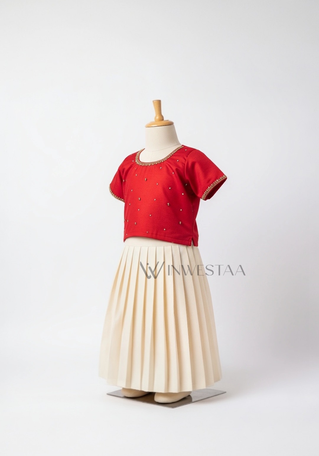 Let your little one dazzle in our kids’ traditional red top paired with a graceful cream pleated skirt. The vibrant crop top features charming embellishments for a festive flair, while the elegant, floor-length skirt ensures comfort and style for any cultural celebration or family gathering. Available in multiple sizes to fit ages 3-10, this outfit is perfect for holidays, weddings, and special occasions. Crafted from premium, breathable fabrics for all-day ease. Enhance her wardrobe with this eye-catching ensemble!