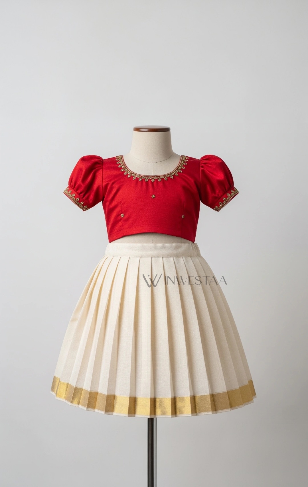 Elevate your child’s festive wardrobe with this stunning traditional kids’ skirt and blouse set. The rich red blouse features intricate gold embellishments, paired beautifully with a pleated cream skirt adorned with an elegant golden border. Perfect for weddings, parties, and cultural celebrations, this ensemble combines timeless style with premium comfort. Available in multiple sizes to ensure the perfect fit. Add a splash of color and tradition to your little one’s special occasions.
