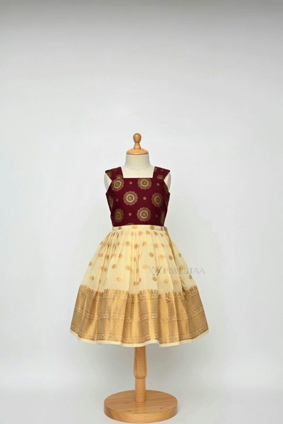 The dress features a sleeveless bodice with cotton fabric in a maroon color. The skirt is a pleated in a creamy beige fabric.