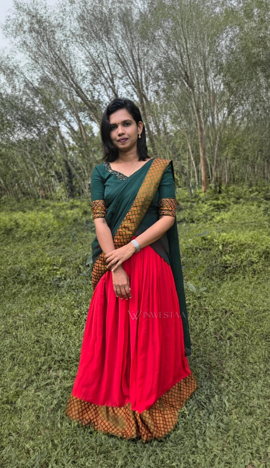 Elevate your festive wardrobe with this exquisite traditional Indian lehenga set, featuring a lush green blouse adorned with intricate golden embroidery. The vibrant red skirt and coordinated matching dupatta complete the ensemble, delivering a timeless and elegant look perfect for weddings, parties, and cultural celebrations. This set is available in multiple sizes to ensure a flawless fit. Please contact us for custom sizing options or to inquire about alternate color choices.